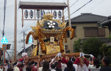 練り出され、町内の大道輿を潜ろうとする現屋台。 |